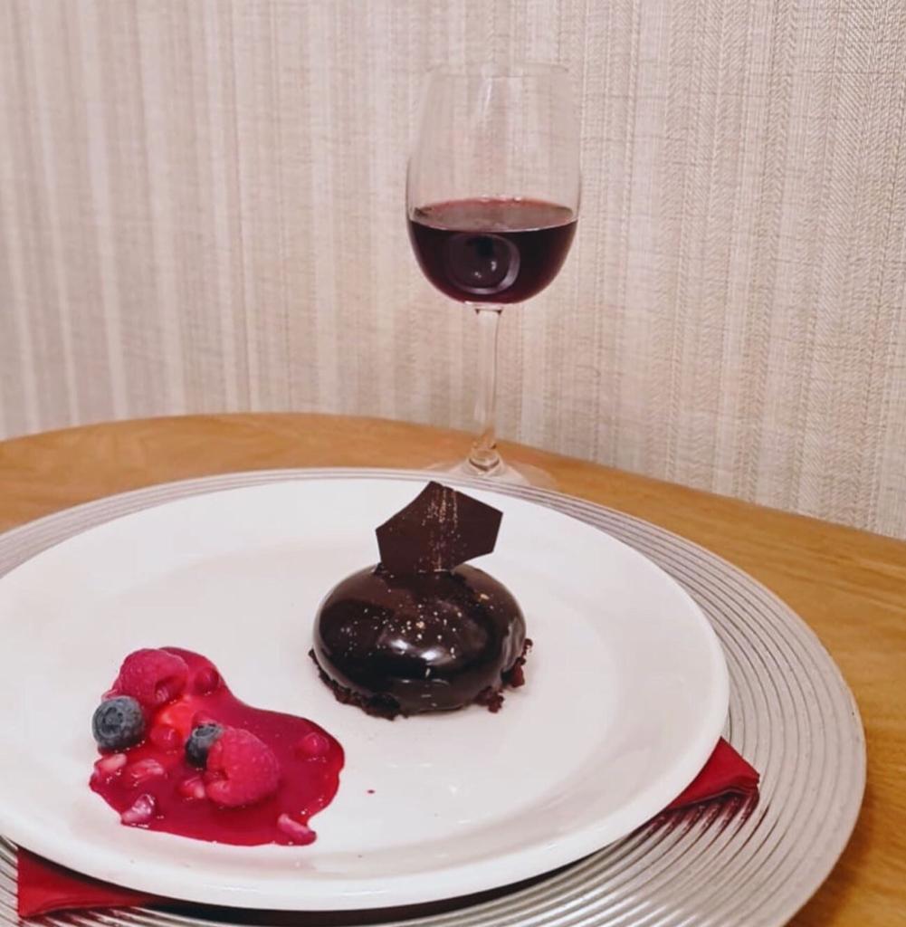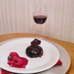 PRIMITIVO / CALAMURI podano w towarzystwie monodeseru czekoladowego w błyszczącej polewie z sosem malinowym i owocami