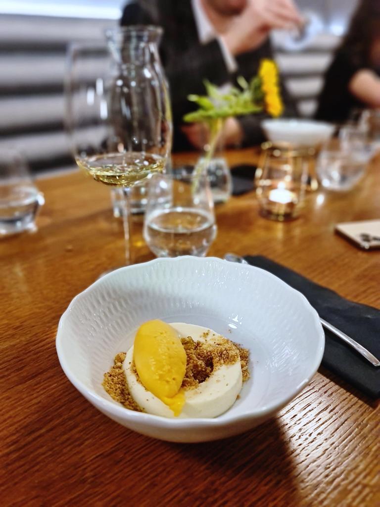 Sorbet z moreli/mus z białej czekolady/kandyzowana gruszka.