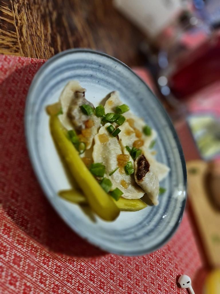 • pierogi z krupniokiem (28 zł) – ręcznie robione tu na miejscu, nawiązujące do Śląskiej kuchni. Pozycja obowiązkowa podczas wizyty 😃.