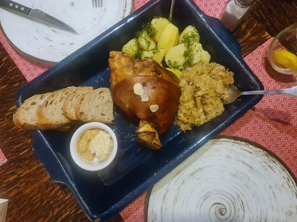 • golonko z pieca piwem podlane , podawane z chlebem i musztardą z chrzanem (62,00 zł) ziemniaczki i kapusta płatne dodatkowo. Chrupiąco skórka a pod nią świetne chude mięsko….pysznie