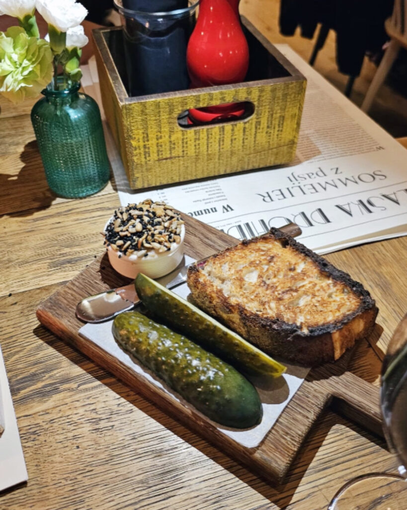 Menu przypominało elitarne czasopismo, zachęcające do dokładnego przejrzenia. Na początek zamówiliśmy Sznitkę – chleb na zakwasie, smalec, prażone ziarno i kiszonego ogórka. Smaki przypominały domowe specjały. Ponieważ było już późno, zdecydowaliśmy się na danie główne, aby nie przesadzić z ilością jedzenia.