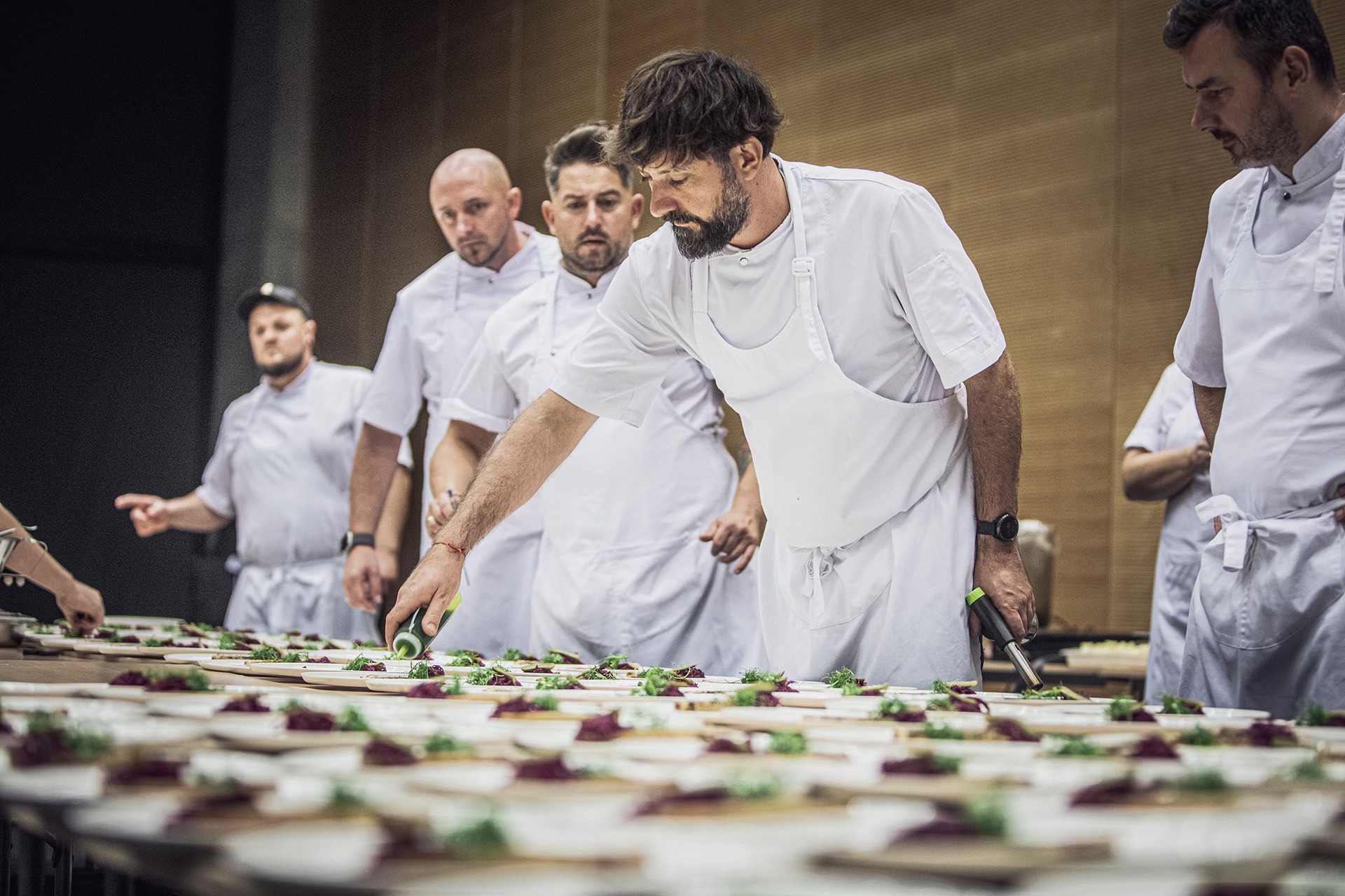 Pierwsza część kolacji, czyli bufet, była prawdziwą eksplozją smaków i dowodem na to, że tradycyjne składniki można podać w nowoczesnej, finezyjnej formie. Gęsi żołądek konfitowany z kaszą gryczaną i aromatycznymi liśćmi dębu był pełen głębi, a wiejski twaróg z czosnkiem w słonym bulionie urzekał kontrastami – kremowa delikatność spotykała się tu z wyrazistą, słoną nutą. Karp duszony w winie z pesto z kopru to natomiast ukłon w stronę staropolskiej kuchni, ale w wersji lekkiej i subtelne. Sekcja słodka nie ustępowała wytrawnym daniom – beza z mascarpone i konfiturą z owoców leśnych to klasyka w najlepszym wydaniu, a karmelowe banoffee z orzechami nerkowca było kwintesencją komfortowego deseru.